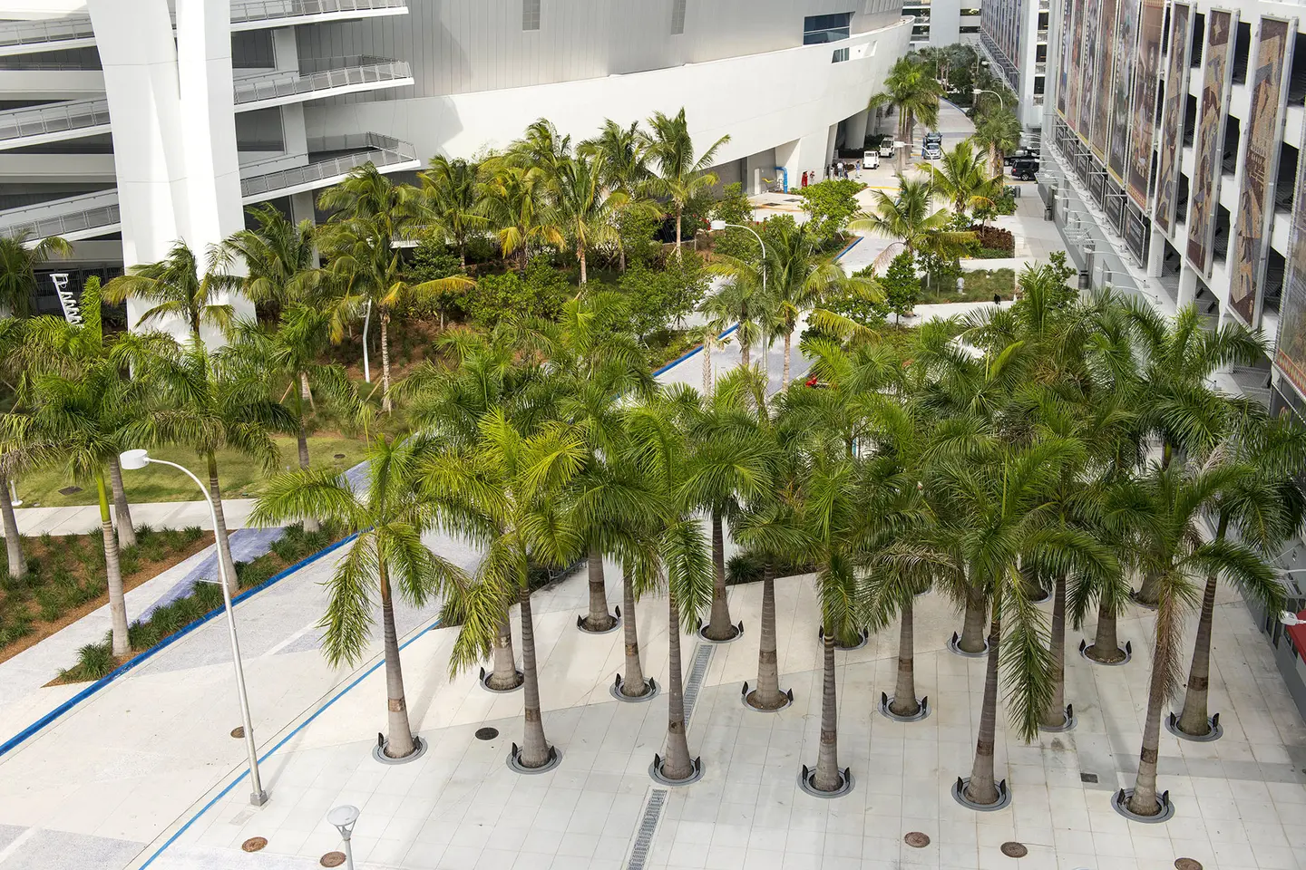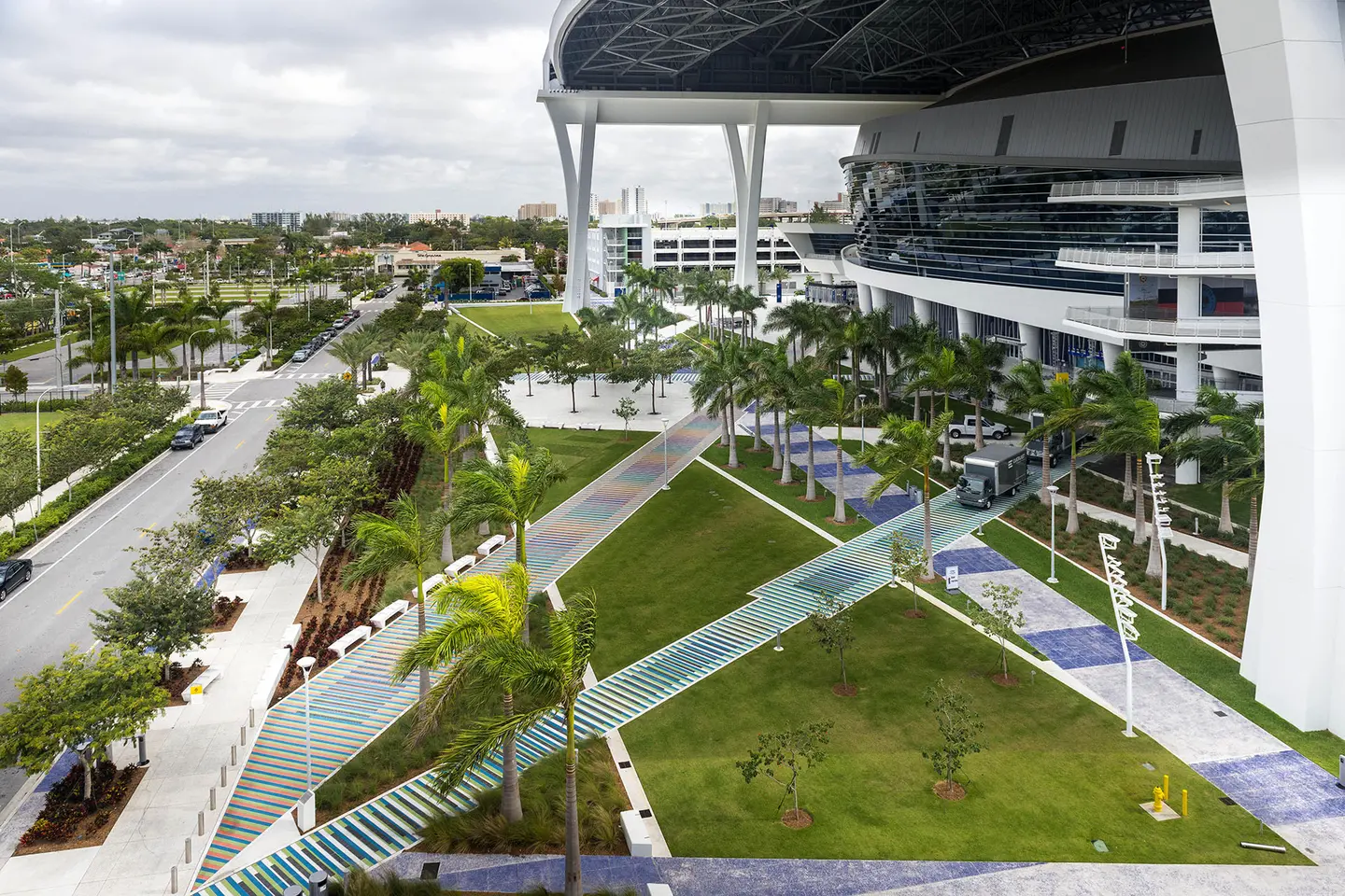 Marlins Park is not only the most sustainable ballpark in the country, it’s also the world’s first retractable-roof ballpark to receive LEED Gold certification. As the landscape contractor for the park’s construction, BrightView packed a number of environmentally features into the ballpark’s landscape. A water smart irrigation system consisting of over 18,000 linear feet of sub-drainage piping reduces water use by an estimated 52%. A native plant palette, entirely sourced from within 500-miles of the park, further reduces water use. The stadium’s colorful hardscape is another sustainable feature, featuring crushed recycled glass pavers.