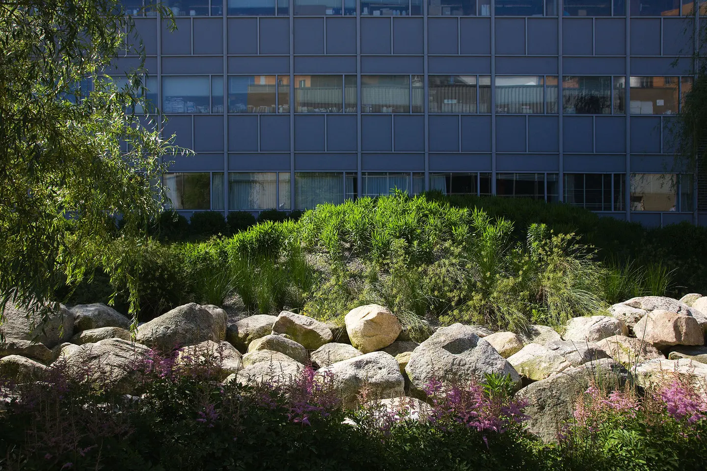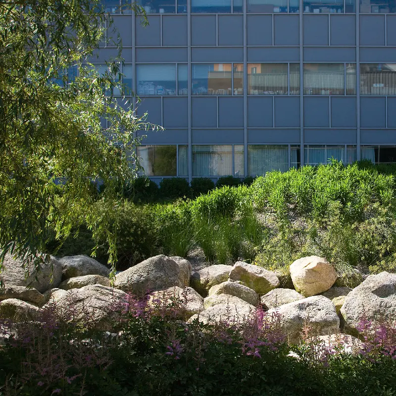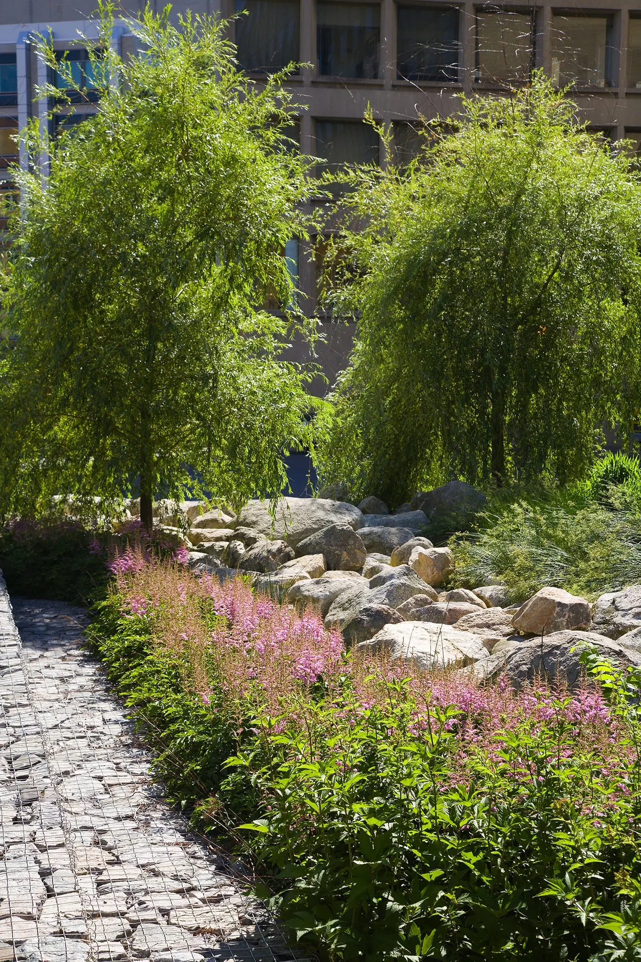 For one of the country's most academically challenging universities, it's only fitting the Massachusetts Institute of Technology's landscape reflect the curiosity and brilliance of its students. Featuring spaces to learn, socialize and relax, the landscape encompasses all aspects of student life. The landscape is true to the New England terrain, with native plants accented by drumlins and boulders. A central garden planted with regional wetland species includes a drainage basin that filters storm water that can be used for gray water purposes.