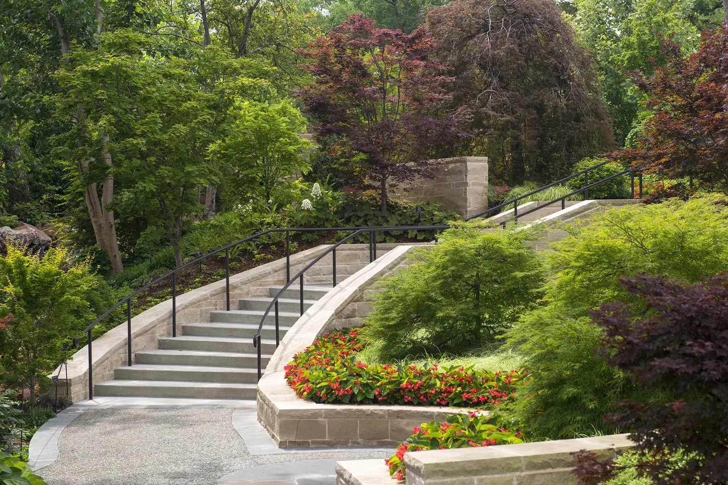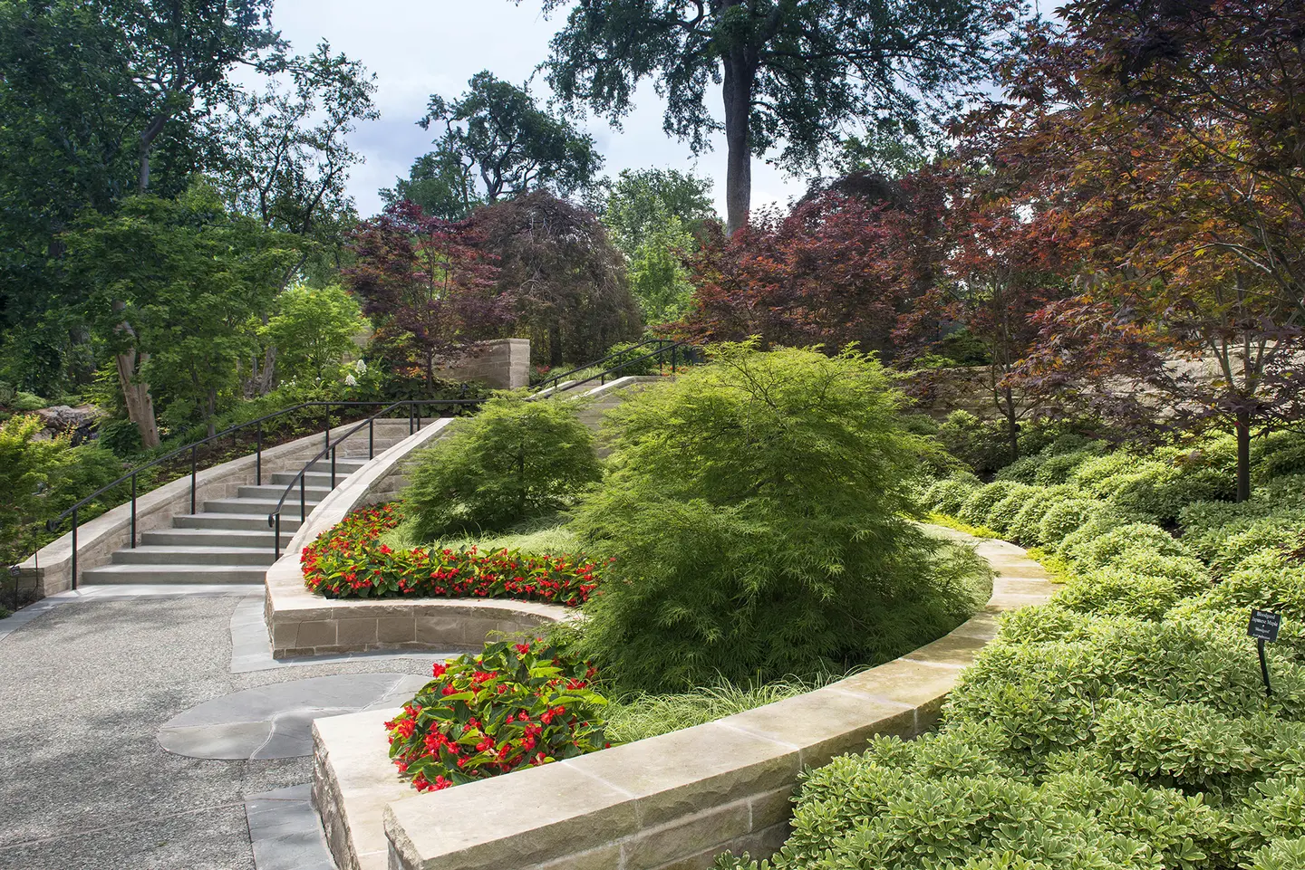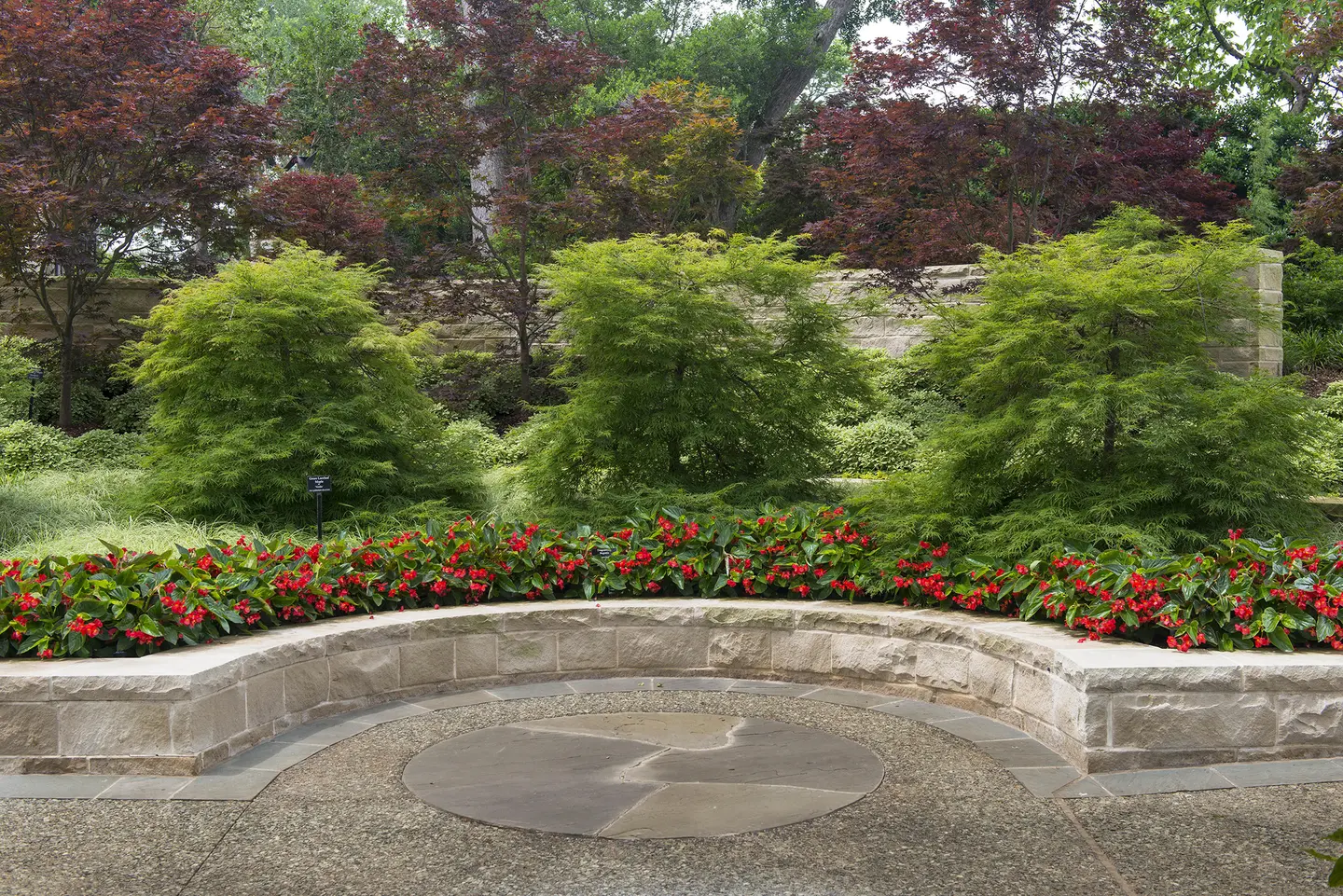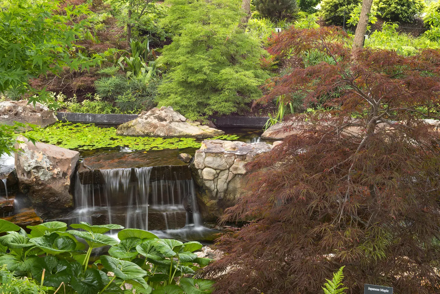 The two acres that are now Red Maple Rill weren’t always impressive. Originally a drainage swale overcome with bamboo, it was transformed into a stunning setting that today showcases more than 80 varieties of Japanese Red Maple. In additional to the Red Maple, visitors enjoy a recirculating creek, numerous waterfalls, stone bridges, and a 100-year old weeping Japanese maple.