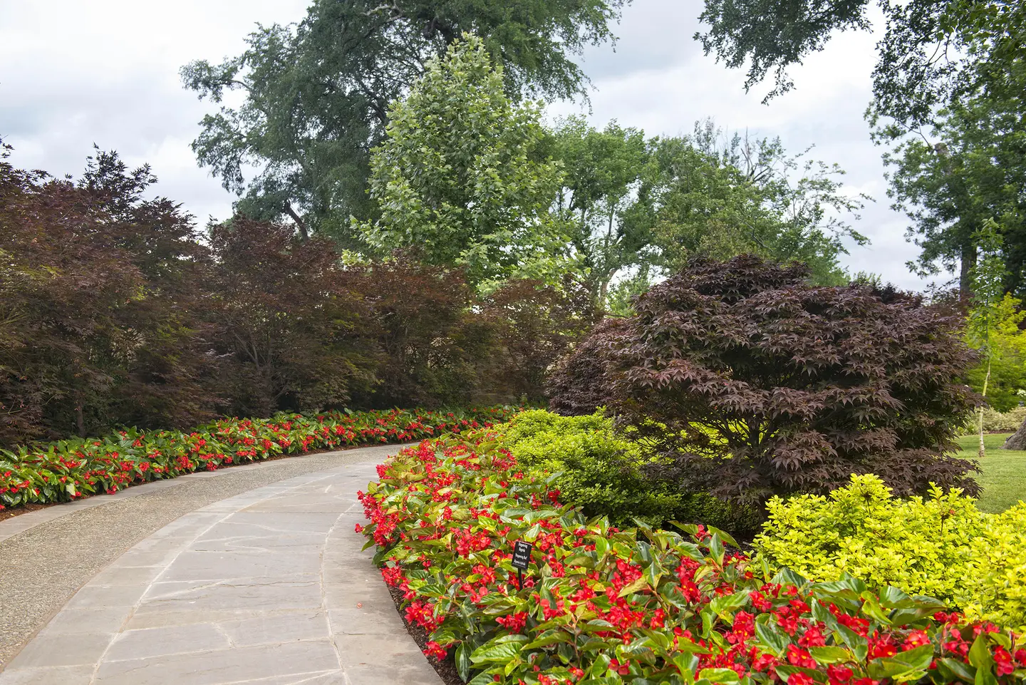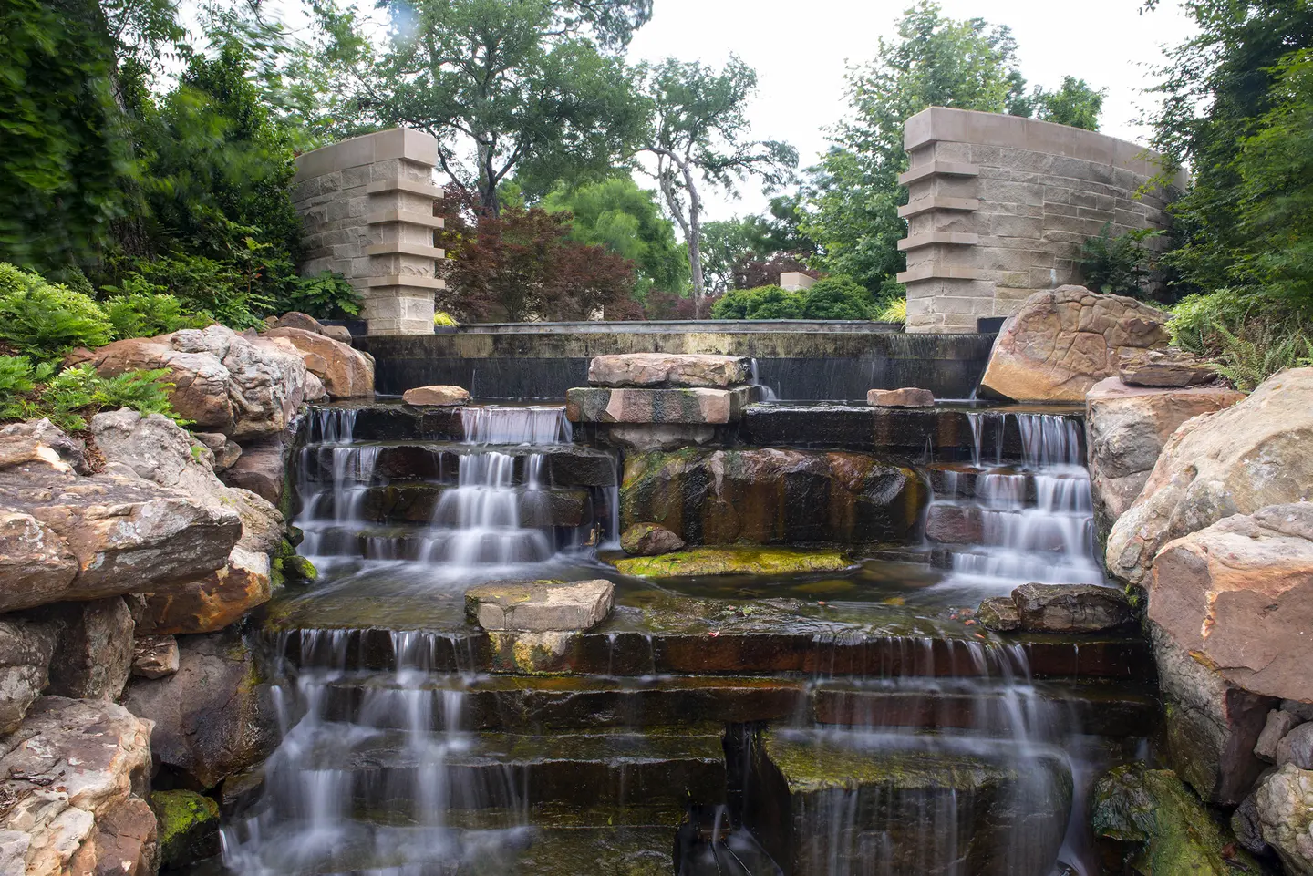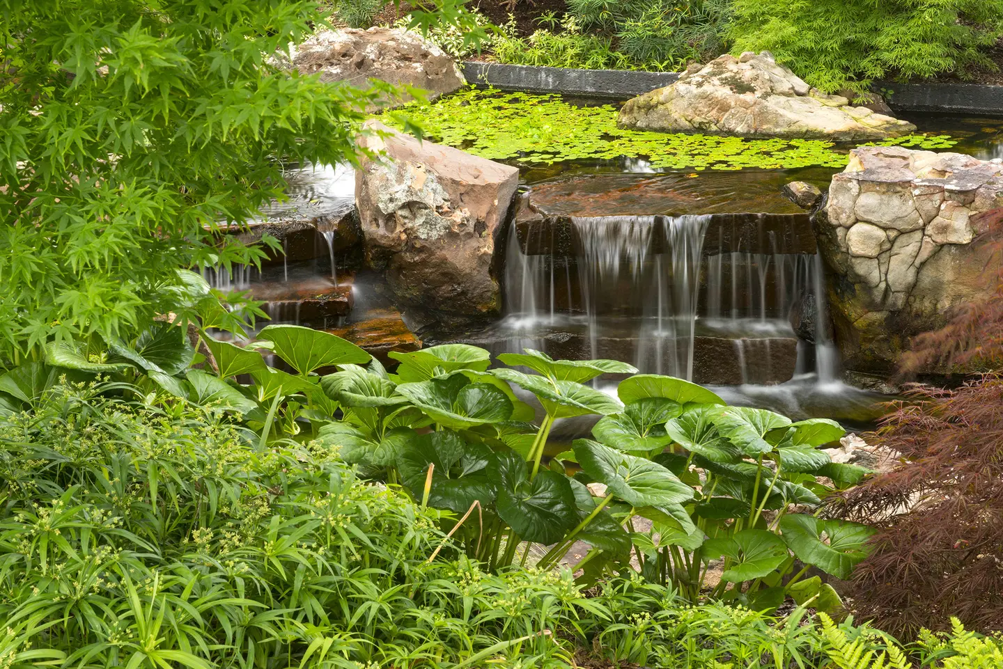 The two acres that are now Red Maple Rill weren’t always impressive. Originally a drainage swale overcome with bamboo, it was transformed into a stunning setting that today showcases more than 80 varieties of Japanese Red Maple. In additional to the Red Maple, visitors enjoy a recirculating creek, numerous waterfalls, stone bridges, and a 100-year old weeping Japanese maple.
