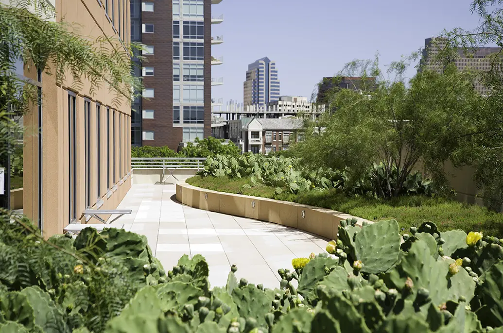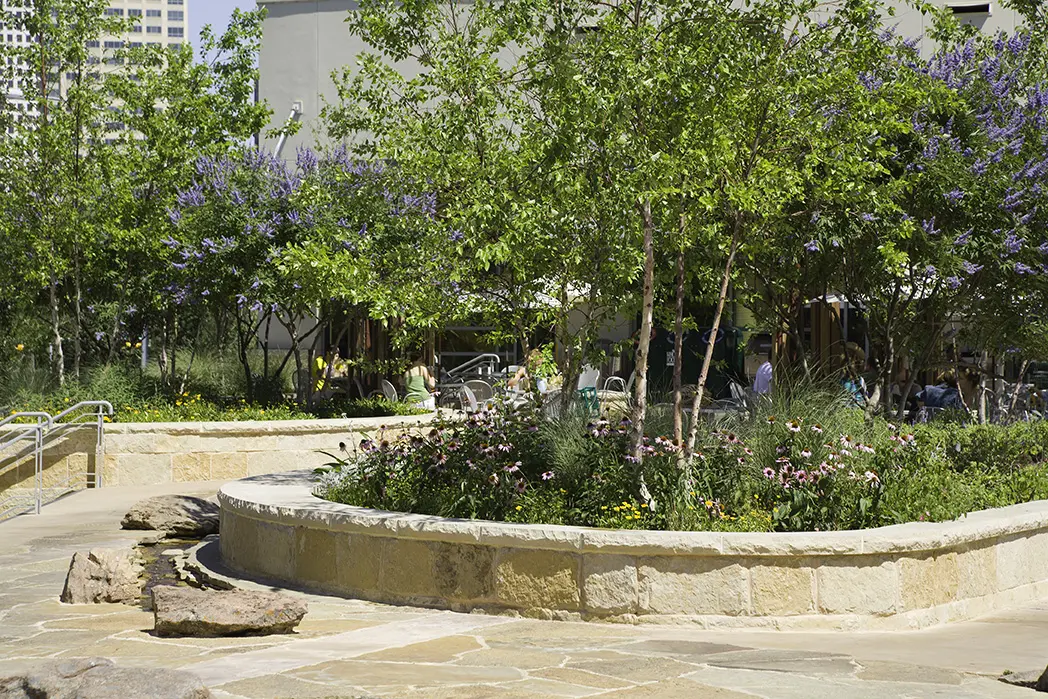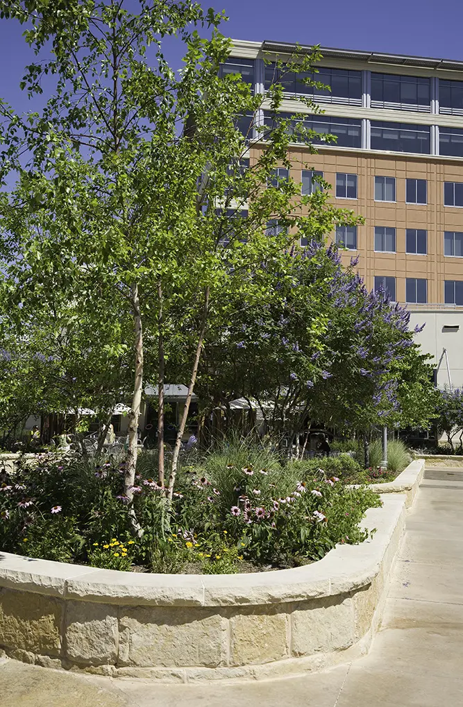 With a sustainable landscape built by BrightView, this downtown project called for skillful time management and traffic control. Using native and adapted material of the region, BrightView installed the rooftop garden and another on the roof of the underground parking garage. The landscape, tied in with its irrigation system and decorative site furnishings, make Whole Foods’ corporate headquarters one of the first environmentally-sophisticated buildings in downtown Austin. To ensure the proper progression of plant material, BrightView maintained Whole Foods for a year after construction was complete.