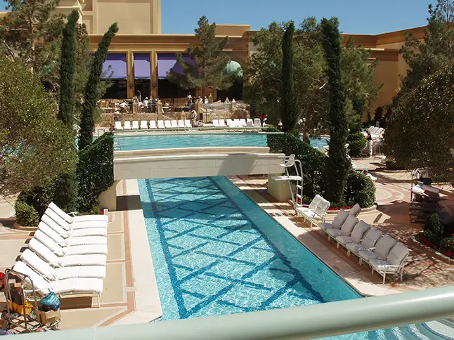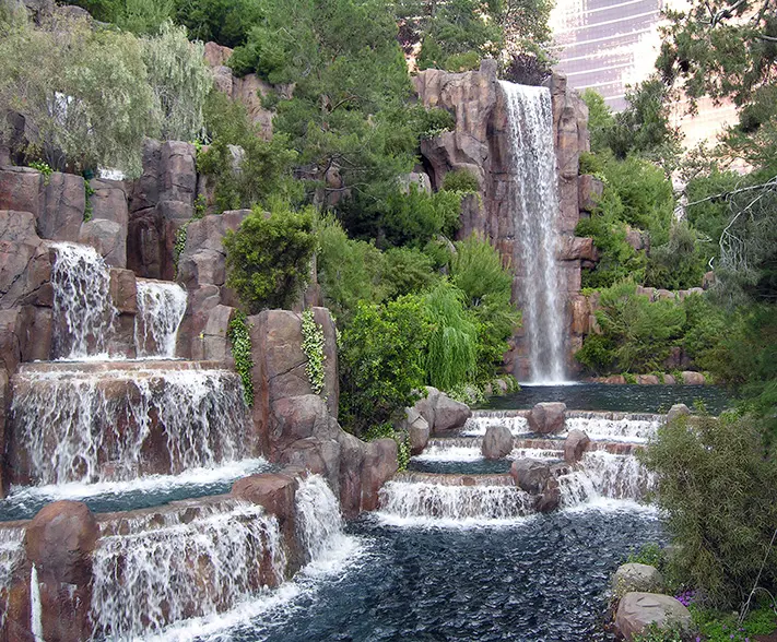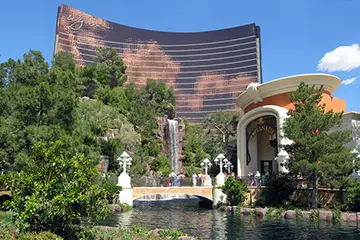 The 42-story Wynn Resort and Casino is a 192-acre, upscale megaresort boasting 18 pools, a towering 150-foot-tall mountain with a five-story waterfall that cascades into a three-acre lake, and an 18-hole championship golf course.
