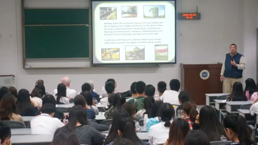 Dominic Desiderio gives presentation on importance of landscape planning at Chengdu University of Information Technology