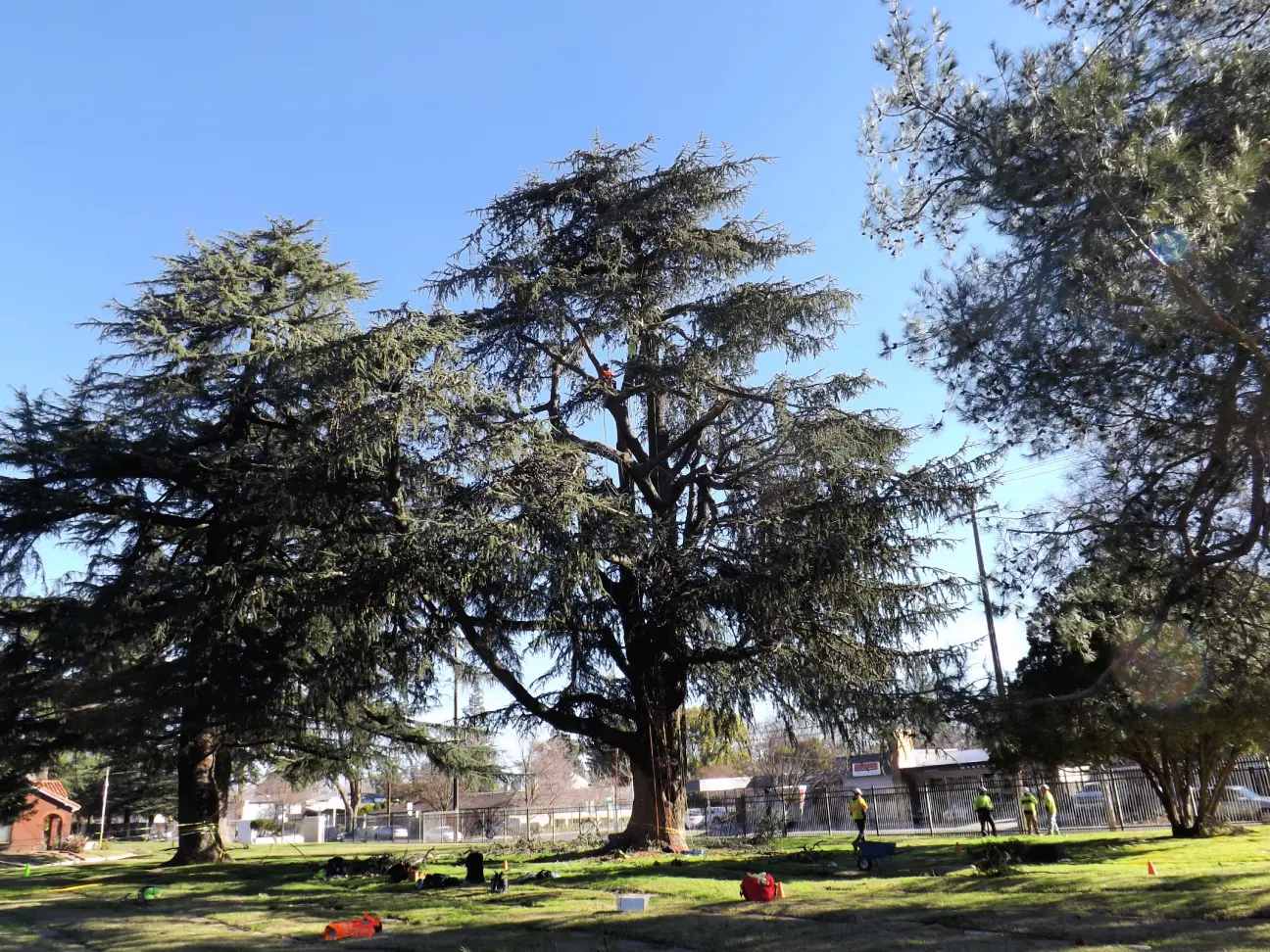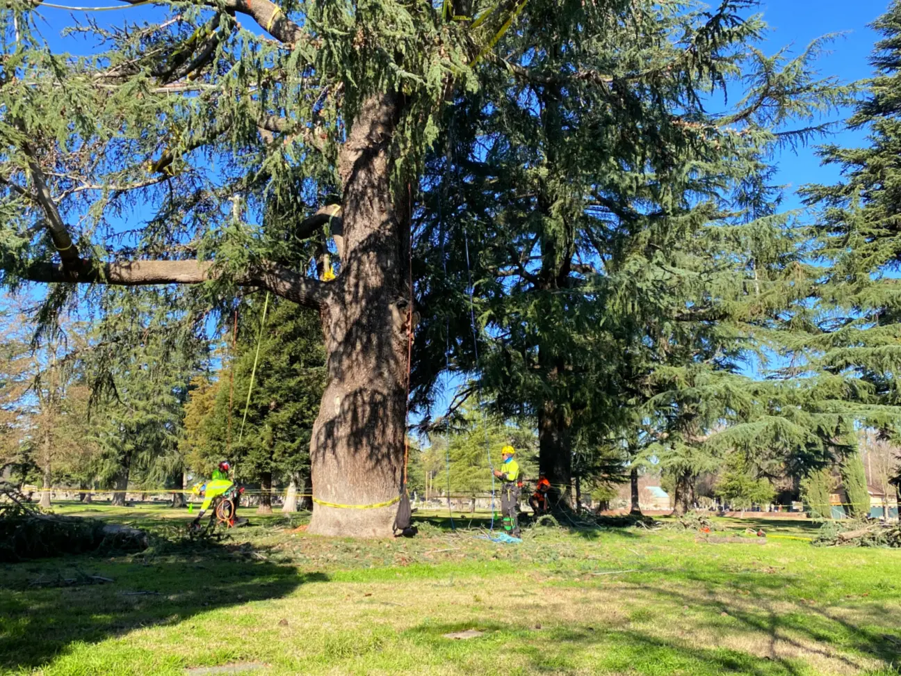 The recent storms in California caused historic rainfall across the state and left the grounds overly saturated. Two Deodar cedar trees in the Odd Fellows Lawn Cemetery and Mausoleum, one standing around 100 feet, began to uproot from the waterlogged soil, posing a significant risk of toppling onto the neighboring businesses and homes and the graves surrounding them.