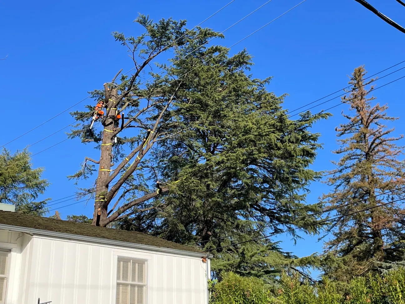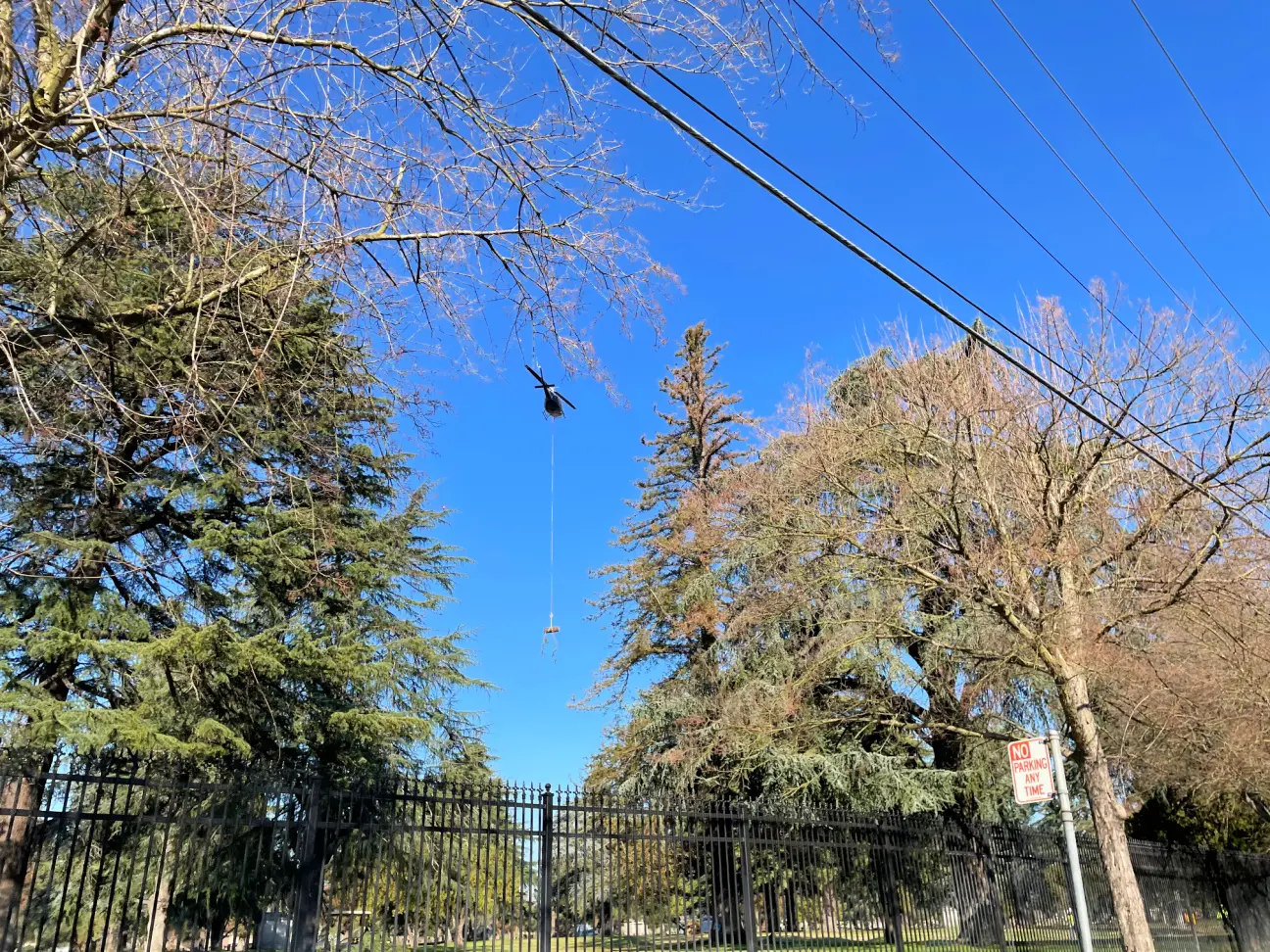 The day before the removal, BrightView was in the tree, “weighing” each limb and branch to get to roughly 1,700 pounds, the optimal weight for the helicopter to lift the cut pieces, and marked them. When the day arrived, the Sacramento Municipal Utility District came out to de-energize the power lines, and then BrightView and the helicopter crew got to work.