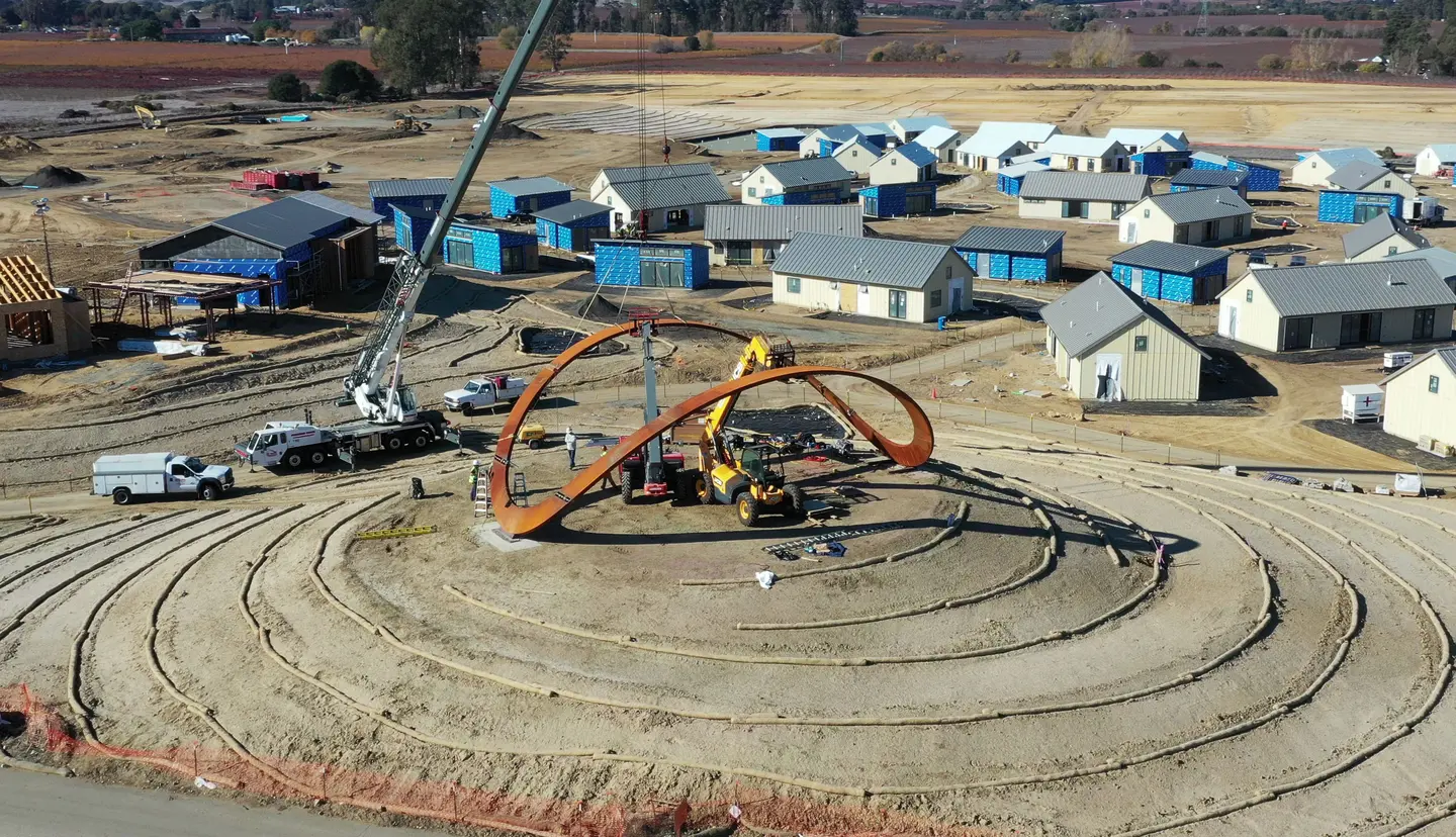 The towering loop of rust colored corten steel, rises above the highest point of Stanly Ranch Resort, the first phase of which is scheduled to open in summer 2021. The structure is 20 feet high, 60 feet long and 40 feet wide and is visible as visitors to Napa Valley cross over the Napa River.