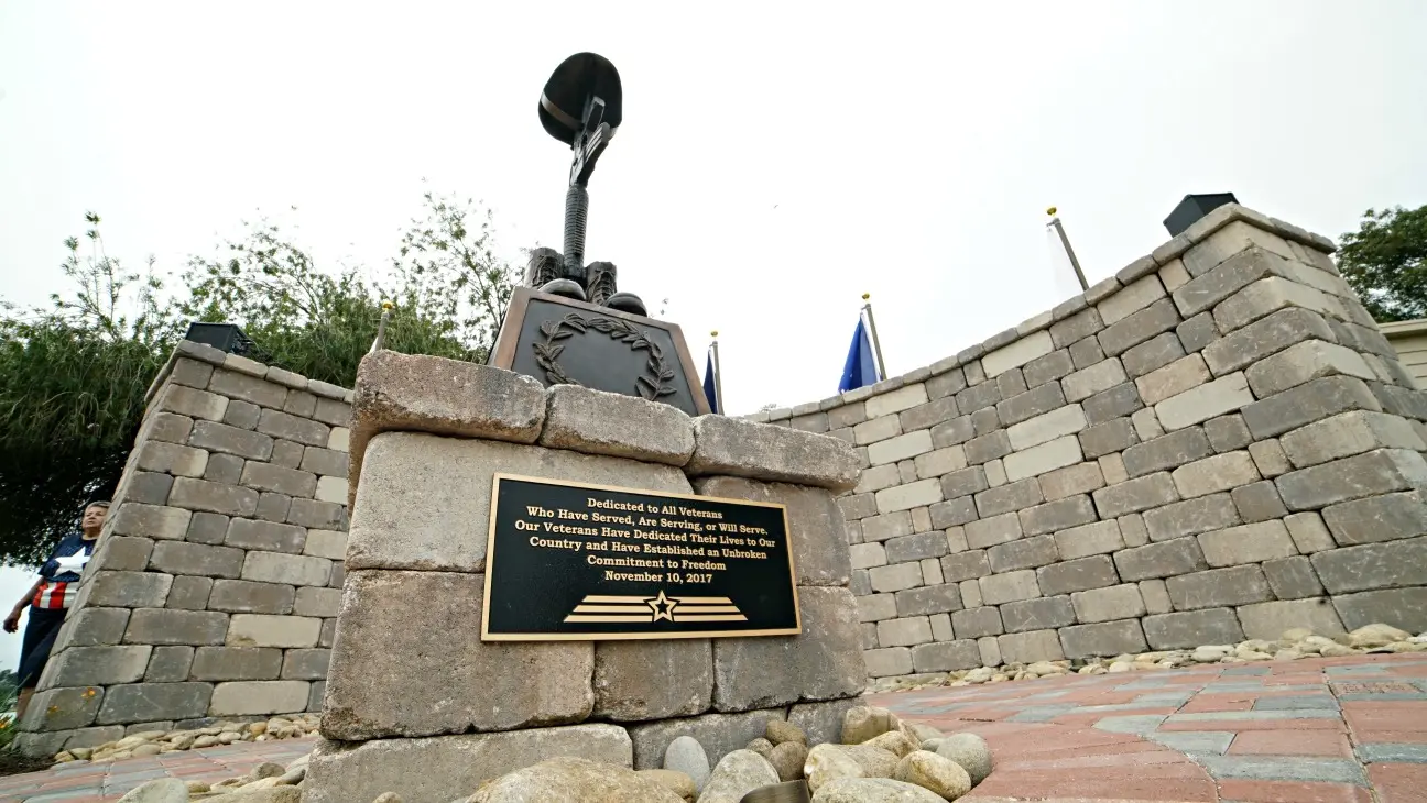 The park features a flag representing each branch of the military, paver walks, a memorial wall, a commemorative plaque, new landscaping, and a first responders’ fire pit area.