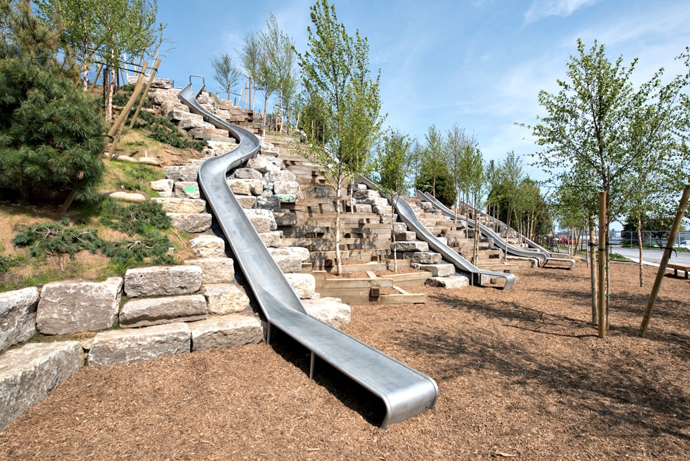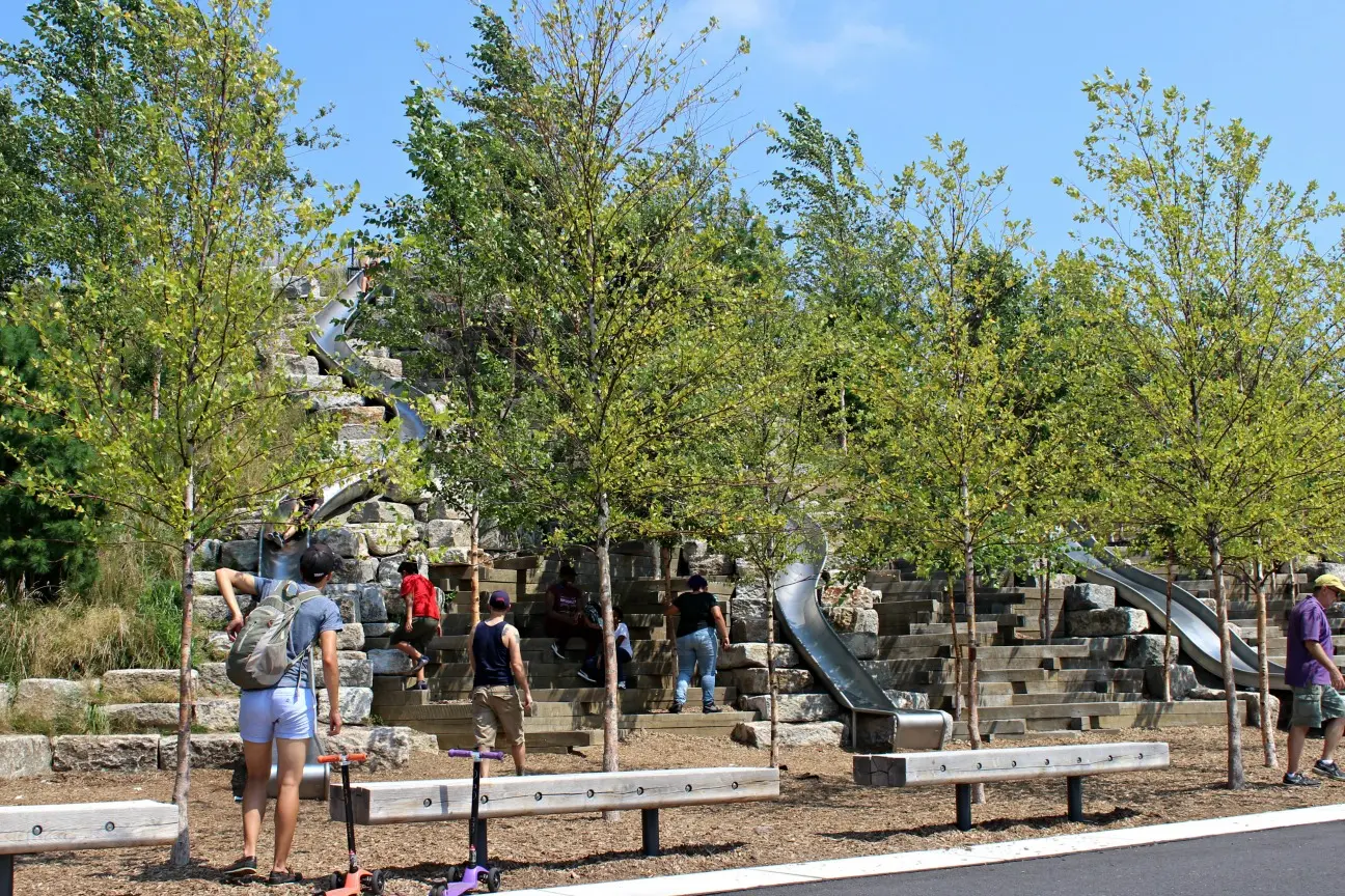 The four hills each give a unique experience to visitors: Grassy Hill rises just 25 feet with a view of the 30-acre park; Discovery Hill rises 40 feet and features ornamental trees and shrubs; Slide Hill also rises 40 feet, but is adorned with four slides for children and adults to enjoy, one of which is 57 feet and is New York City’s longest slide; and Outlook Hill rises 70 feet, with both a winding path and an off-terrain climb over granite blocks salvaged from the island’s old seawall.