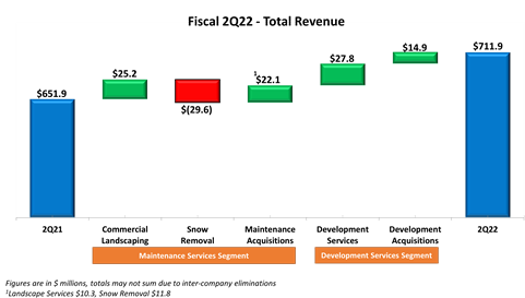 For the second quarter of fiscal 2022, revenue in the Maintenance Services Segment increased by $17.7 million, or 3.3%, from the prior year. The increase was primarily driven by a $25.2 million, or 8.1%, increase in underlying commercial landscape services underpinned by a combination of contract services growth and to a greater extent ancillary services growth, as well as a $22.1 million revenue contribution from acquired businesses. Offsetting this was a decrease of $17.8 million in snow removal services principally driven by lower snowfall, net of $11.8 million from acquired businesses.