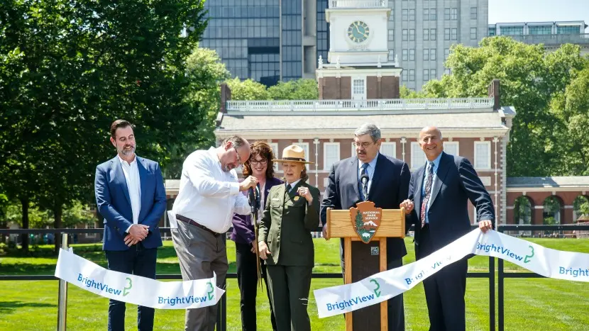 BrightView’s in-kind donation to Independence National Historical Park’s landscape includes the replacement of nearly 100,000 square feet of damaged sod, irrigation repair, tree care, and improvements to the gardens, as well as maintenance of the landscape for the next year.